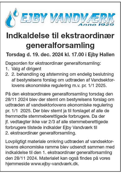 Ejby Vandværk indkalder til 2. ekstraordinær generalforsamling